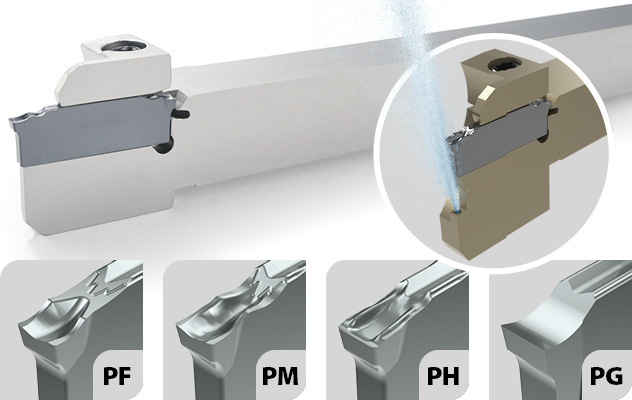 For this series of cutting tools, there are 4 different chipbreaker designs in different qualities. The PF, PM, PH and PG chipbreakers are designed to cover applications from rom low-medium feed up to high feed machining of a wide range of materials such as steel, stainless steel and cast iron - but also aluminium alloys.